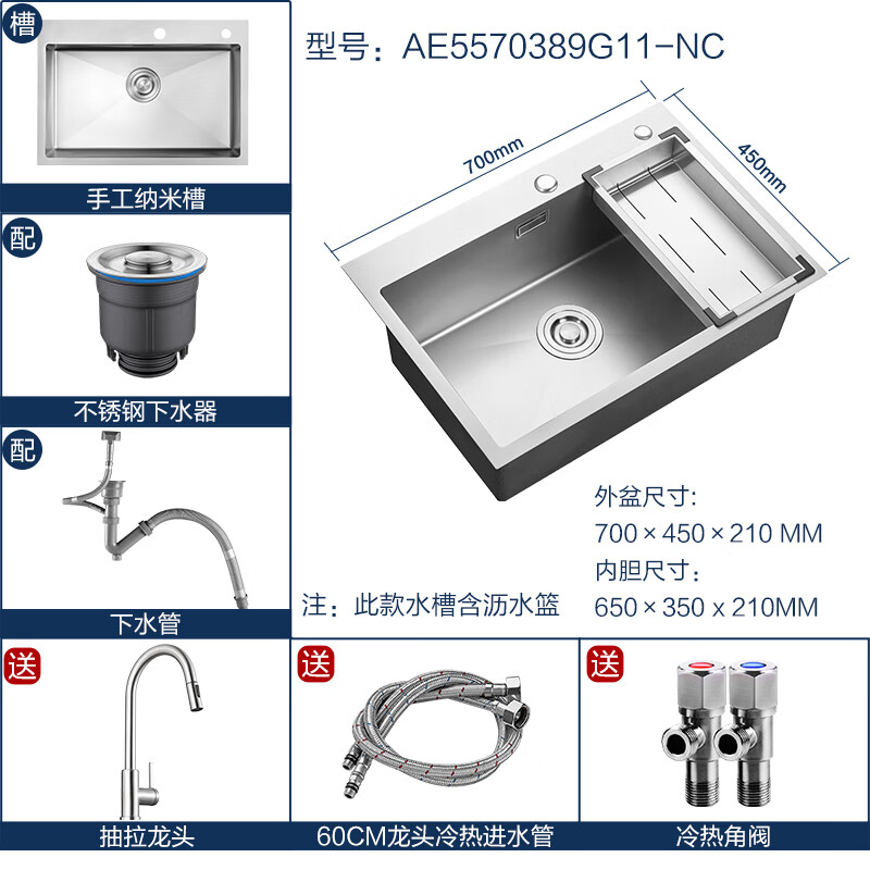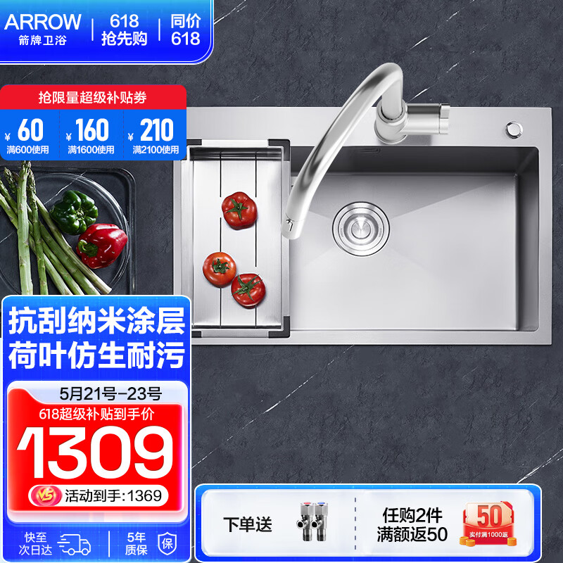 箭牌(ARROW)纳米手工水槽大单槽304不锈钢加厚厨房洗菜池洗碗盆一体盆 70*45银纳米槽(含沥水篮+龙头)价格:1574.00元!