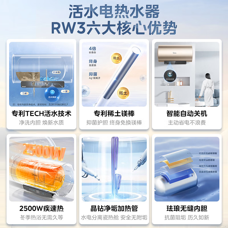 美的(Midea)储水式电热水器家用一级能效 繁星计划活水焕新舱 免换镁棒水电分离APP智能操控速热RW系列热水器 80L 2500W RW3 APP智控省电 一级能效价格:2299.00元!