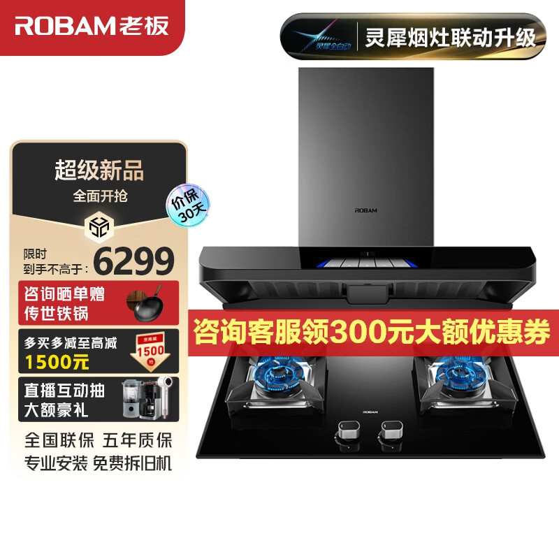 老板(Robam)灵犀全自动抽油烟机欧式顶吸双腔变频25大风量家用燃气灶吸油烟机灶具套装63A3S+57B2D液化气价格:6299.00元!