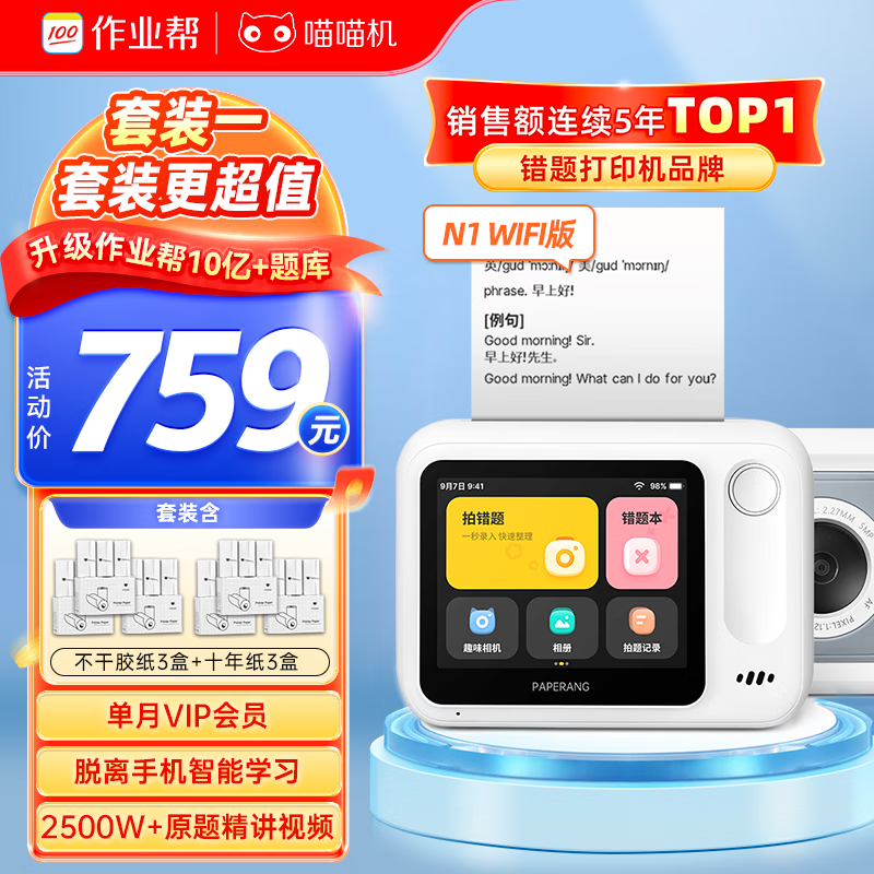 喵喵机N1 作业帮学生错题整理神器家用热敏脱离手机可触屏智能学习错题打印机 WIFI版(套餐一)价格:759.00元!