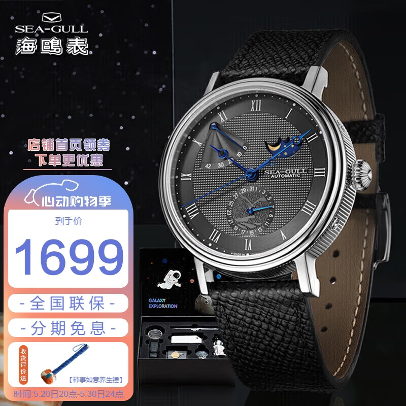 海鸥(SEAGULL)手表男士自动机械表 男表送男友礼物 月相腕表文创礼盒(玄夜)价格:1899.00元!