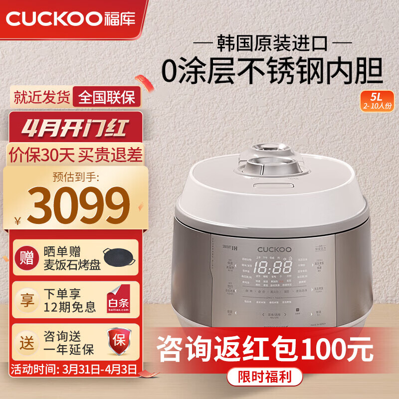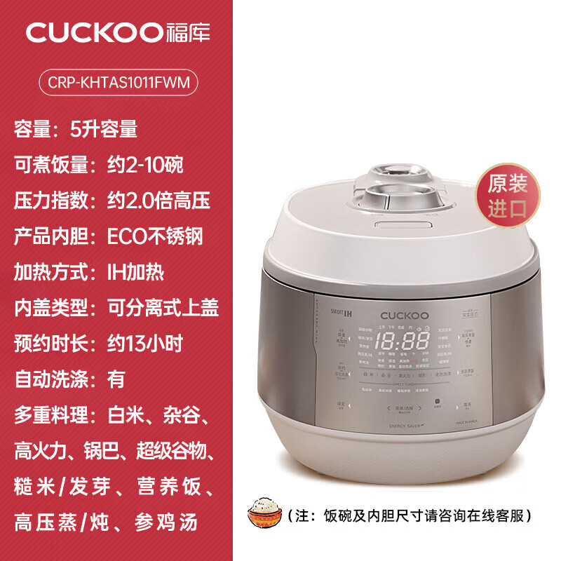 福库(CUCKOO)电饭煲韩国原装进口4-5人家用大型容量电饭锅IH加热高压无压可切换5升多功能快速蒸煮米双压电饭煲 上新CRP-KHTAS1011FWM 5L价格:3799.00元!