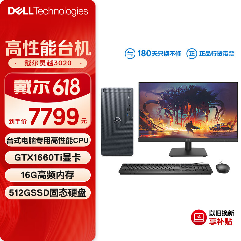 戴尔(DELL)灵越3020 台式机电脑 (酷睿13代i7-13700F 16G 512GSSD GTX1660Ti显卡)23.8英寸大屏显示器价格:7799.00元!