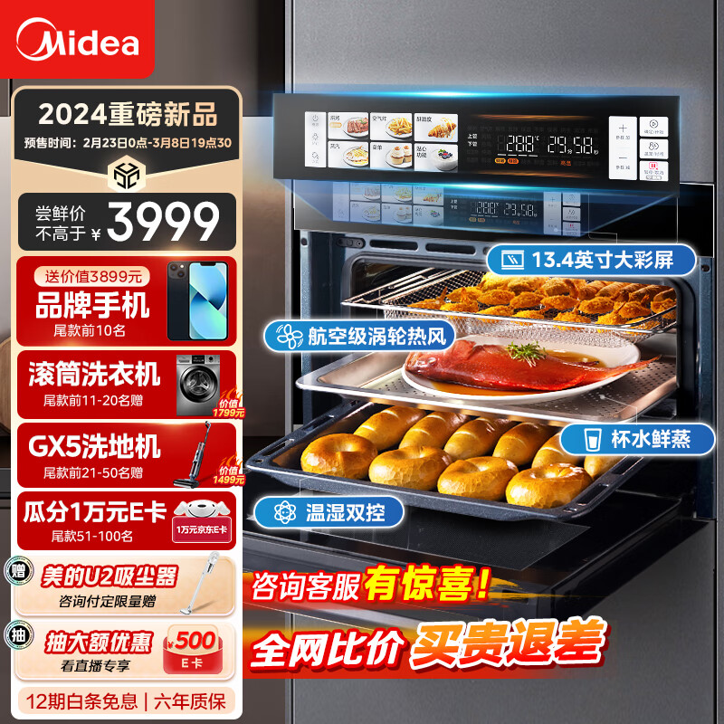 美的无边系列55L嵌入式蒸烤箱一体机 温湿智控 涡轮热风 蒸箱烤箱 蒸烤炸炖4合1体机SX5价格:3999.00元!