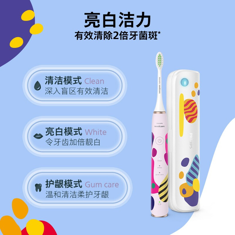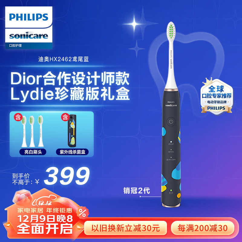 飞利浦(PHILIPS)电动牙刷成人情侣款 礼物 带3支刷头+杀菌牙刷盒Lydie Bossuet-Dior合作设计师款HX2462/02蓝价格:459.00元!