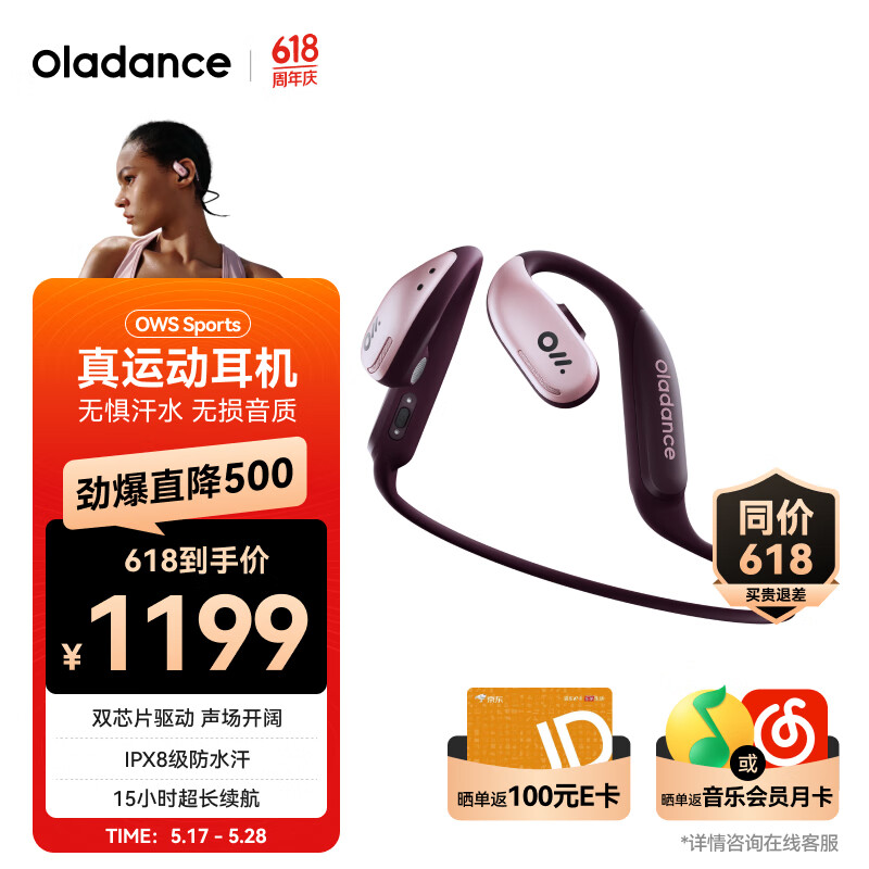 OladanceOWS Sports开放式耳机不入耳式蓝牙耳机防水降噪IPX8运动耳机超长续航 粉价格:1199.00元!