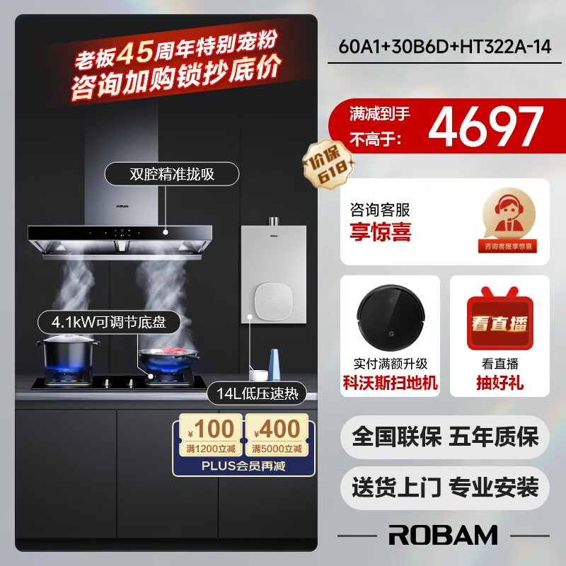 老板(Robam)厨房多件套抽油烟机双腔欧式顶吸21风量免拆洗家用吸油烟机灶具燃气热水器60A1+30B6DT+HT322A-14价格:5197.00元!