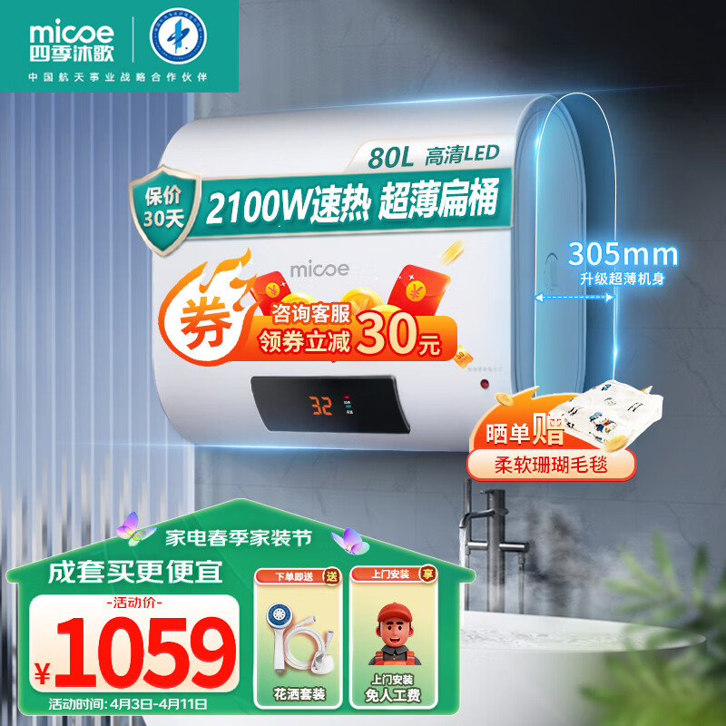 四季沐歌(MICOE)电热水器温度数显超薄储水式80L 速热2100W 家用扁桶适用5-6人 M3-S80-21-BH1价格:1059.00元!