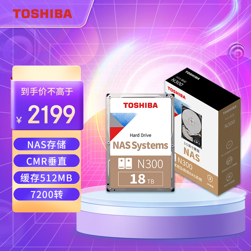 东芝(TOSHIBA)18TB NAS网络存储机械硬盘私有云家庭文件存储7200转 512MB SATA接口N300系列(HDWG51J)价格:2199.00元!