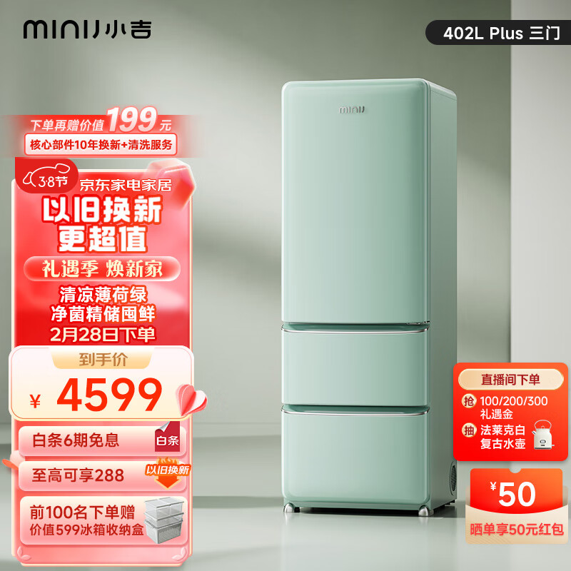 小吉(MINIJ)小吉402LPlus客厅冰箱双变频风冷无霜一级能效超薄嵌入式三门冰箱丨干湿分储变温低噪BCD-JY402G2价格:4599.00元!