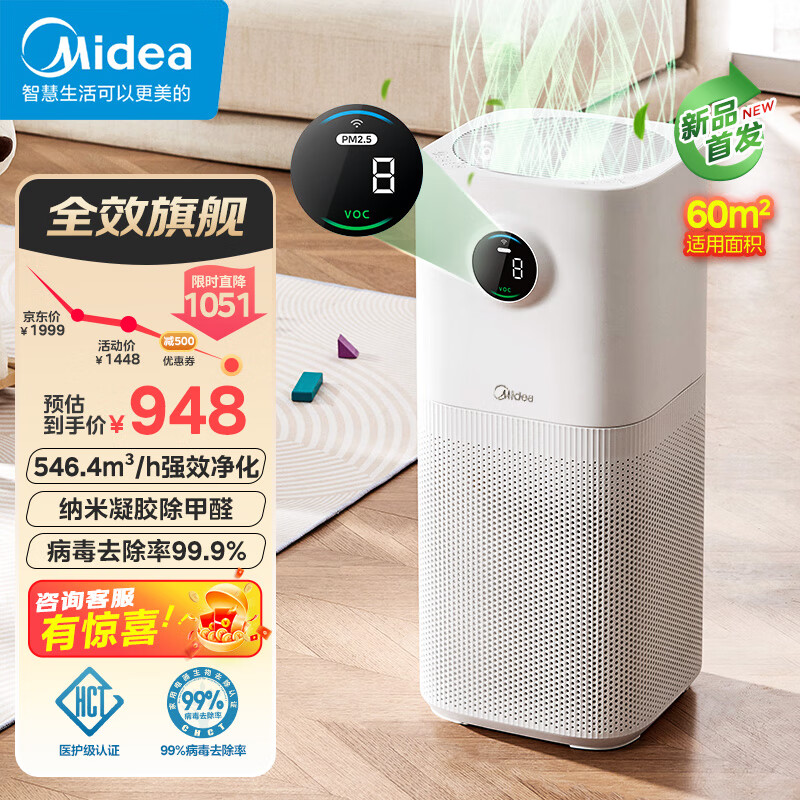美的【六重净化】空气净化器高效分解甲醛除烟味异味99.99%病菌去除率卧室专用空气消毒机KJ500G-L1价格:1999.00元!