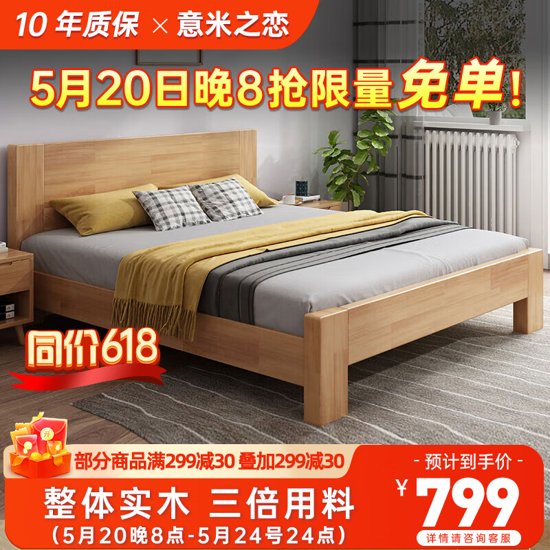 意米之恋橡木床实木床 主卧双人床 卧室家具 品质大板 208cm*100cm*80cm价格:859.00元!