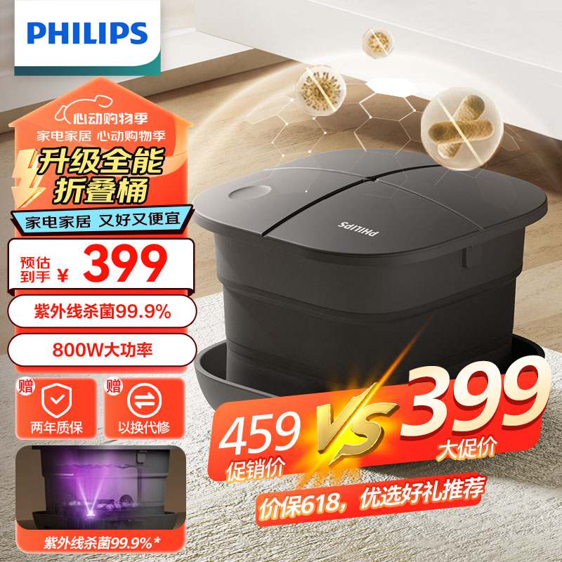 飞利浦(PHILIPS)足浴桶 折叠泡脚桶 UV紫外线99.9%杀菌 加热控温全自动按摩恒温泡 洗脚盆足浴盆节日礼品5107F价格:549.00元!