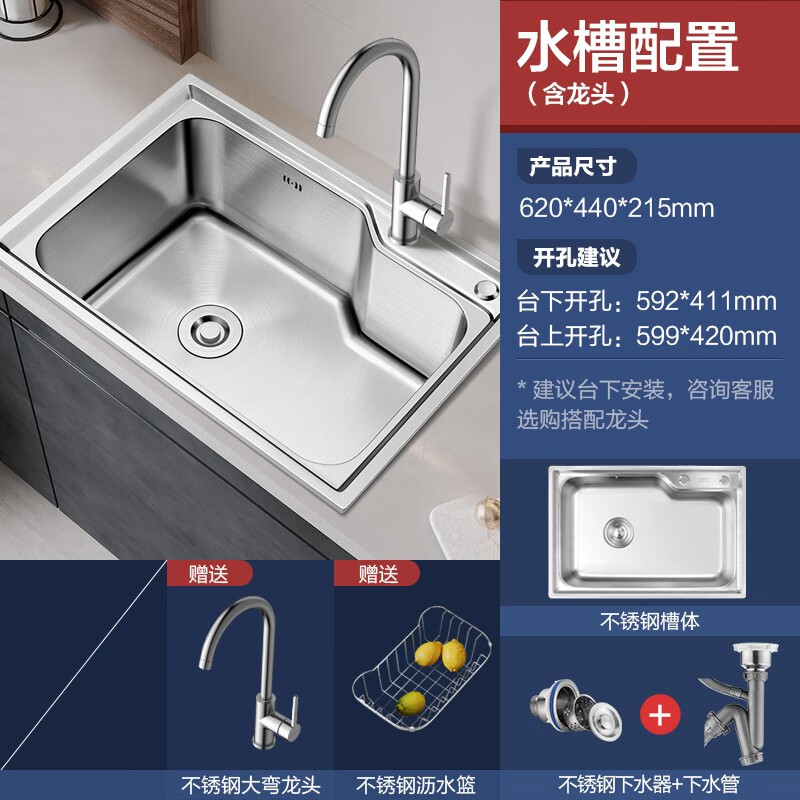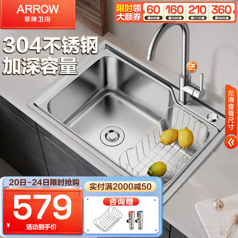 箭牌(ARROW)304不锈钢厨房水槽龙头套装小户型洗菜盆单槽支持台上台下槽安装 B1款 62*44cm+冷热龙头价格:679.00元!