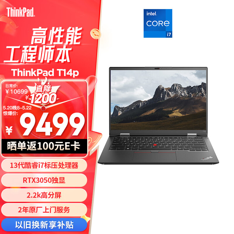 ThinkPad T14p 联想14英寸高性能标压商务办公游戏笔记本电脑 13代酷睿i7-13700H 16G 512G RTX3050 2.2K价格:9499.00元!