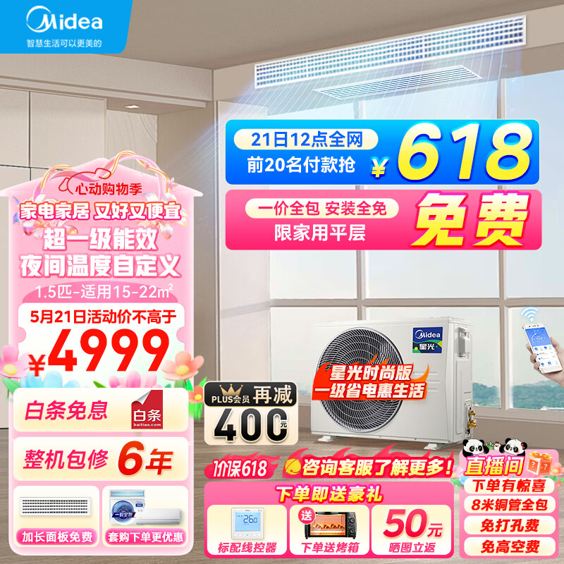 美的(Midea)中央空调风管机一拖一1.5匹一级能效家用嵌入式卧室隐形嵌系列星光时尚版KFR-35T2W/BN8-XG(1)Ⅲ价格:5099.00元!