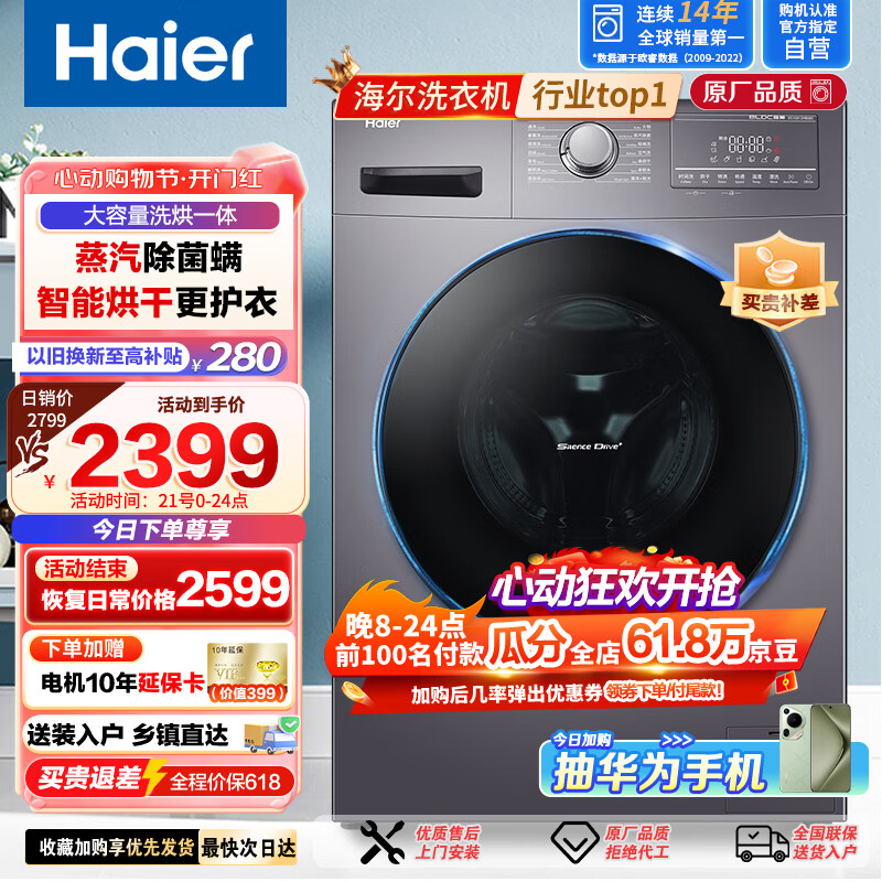 海尔(Haier)超薄洗烘一体洗衣机带烘干 全自动10公斤大容量变频滚筒洗衣机 除菌空气洗香薰洗烘干容量以旧换新价格:2399.00元!