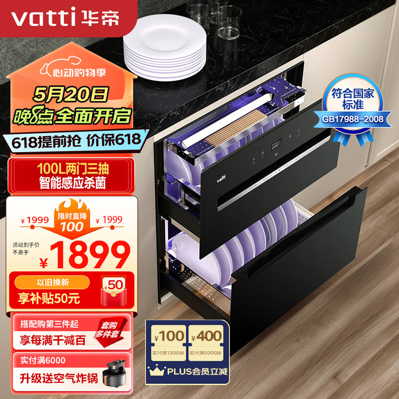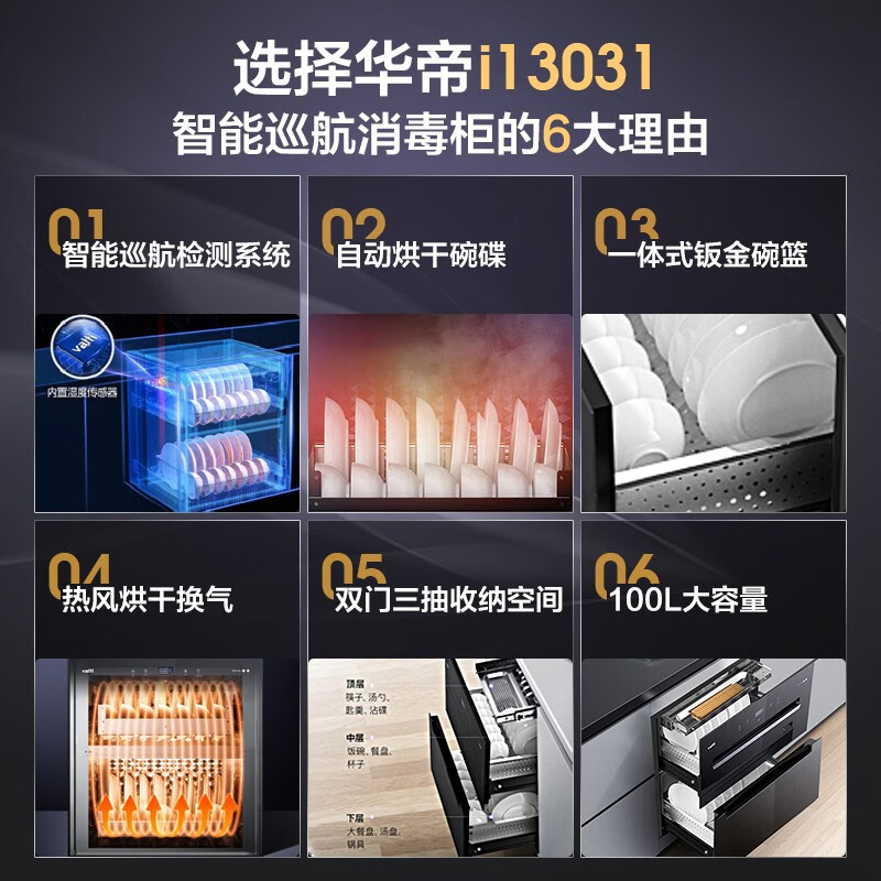 华帝(VATTI)消毒柜家用嵌入式 100升大容量两门三抽 消毒碗柜 紫外线智能感应杀菌 自动烘干 i13031价格:1999.00元!
