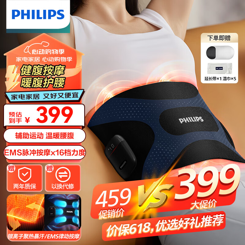 飞利浦(PHILIPS)懒人腰带 腰部按摩器腰腹健身仪 EMS微电流无线热敷暴汗束腰收腹护腰带揉腹仪暖腹带送男女友3305B价格:529.00元!