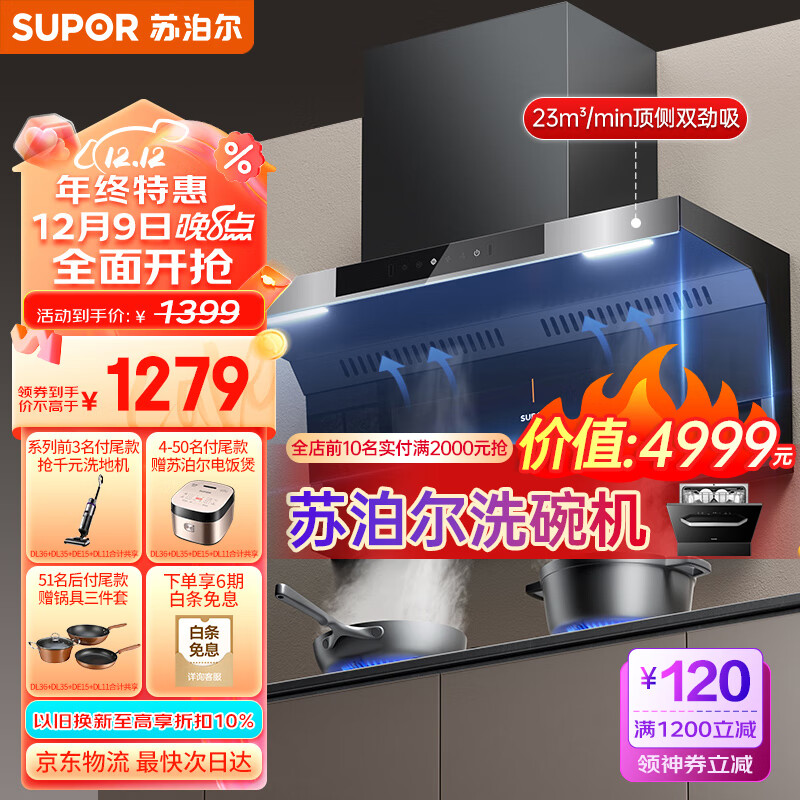 苏泊尔(SUPOR) 抽油烟机顶侧双吸油烟机7字型 23立方挥手感应免拆洗家用厨房吸油烟机 DL11单烟机价格:1399.00元!