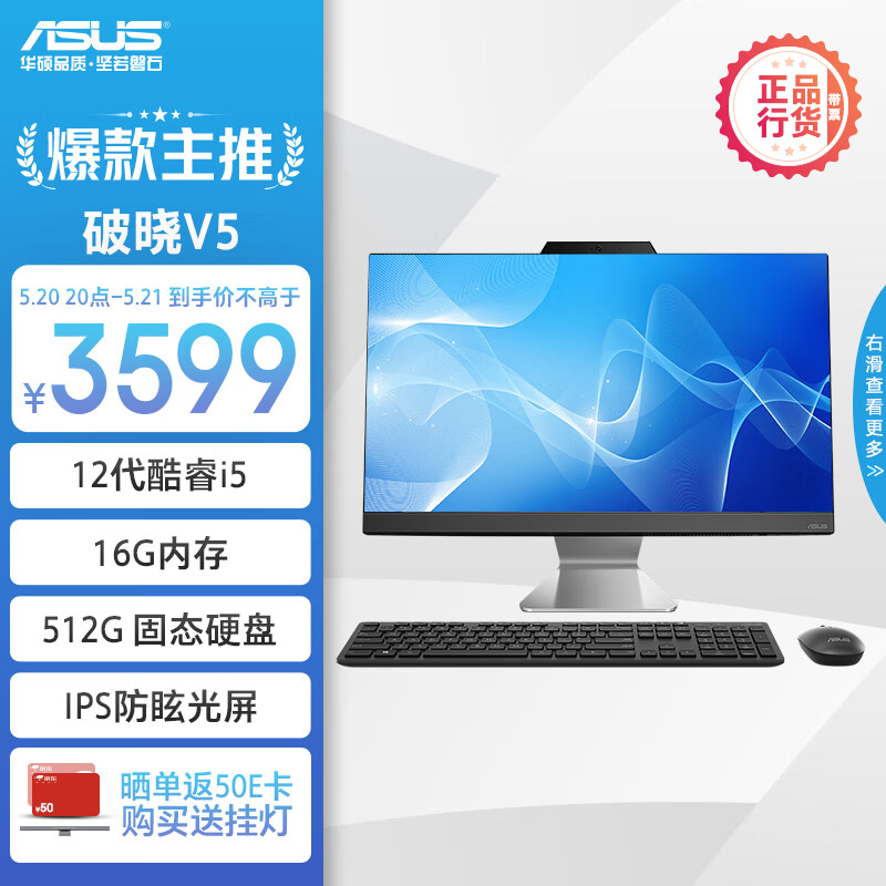 华硕破晓V5 23.8英寸家用商用一体机电脑台式电脑(12代i5-1235U 16G 512G固态 WIFI6蓝牙)黑价格:3599.00元!