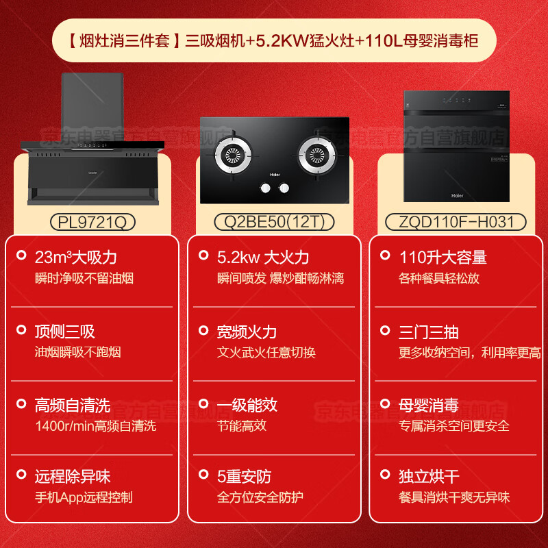海尔(Haier)智家出品抽油烟机三件套 23m3大吸力烟机 5.2kW燃气灶 110升嵌入式消毒柜PL9721Q+Q2BE50+H031价格:4199.00元!