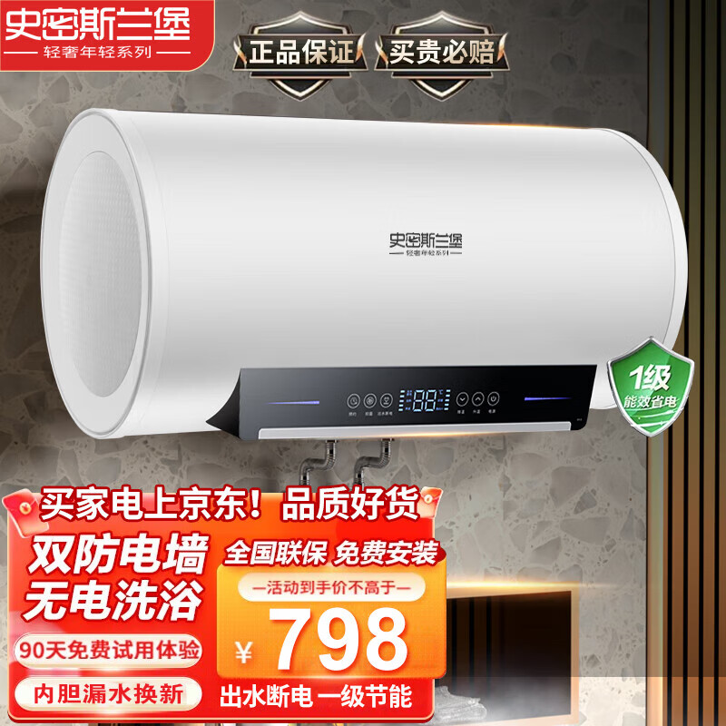 史密斯兰堡电热水器 家用60升L储水式2200W双重防护卫生间出租房速热洗澡淋浴机一级能效DSZF-T03Y60价格:768.00元!