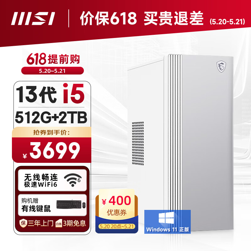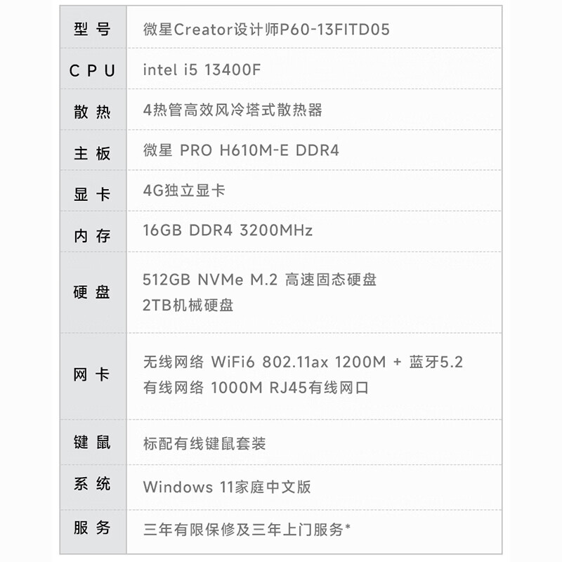 微星 设计师P60办公台式电脑(i5-13400F 16G 512G+2T 4G独显 WiFi6)商用全套diy组装整机迷你单主机价格:4099.00元!