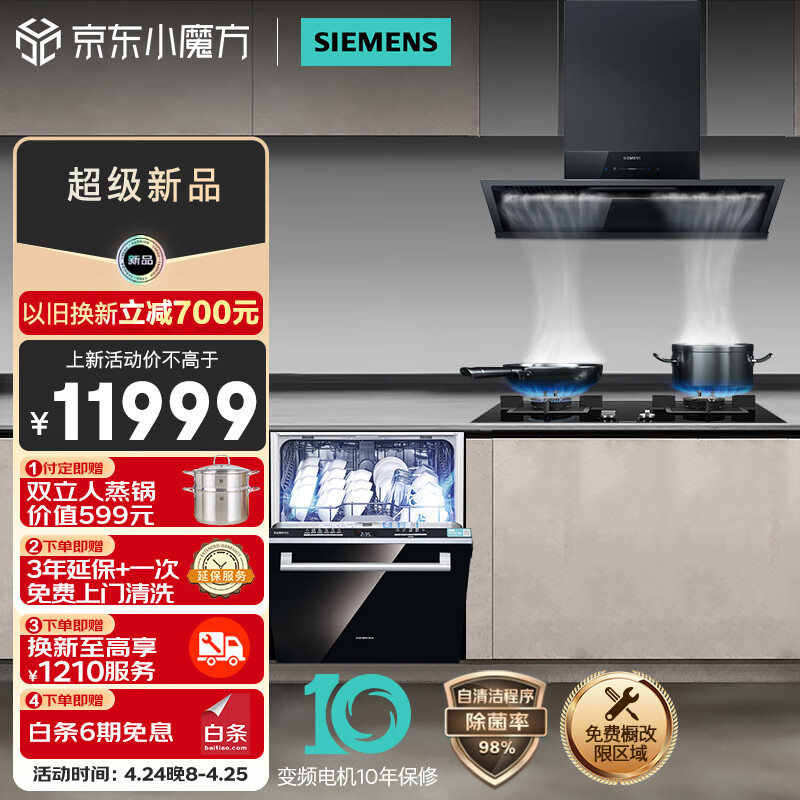 西门子(SIEMENS)超薄侧吸油烟机燃气灶14套大容量智能烘干洗碗机家用套装厨房三件套1B3BNW+23MP+SJ63E价格:11999.00元!