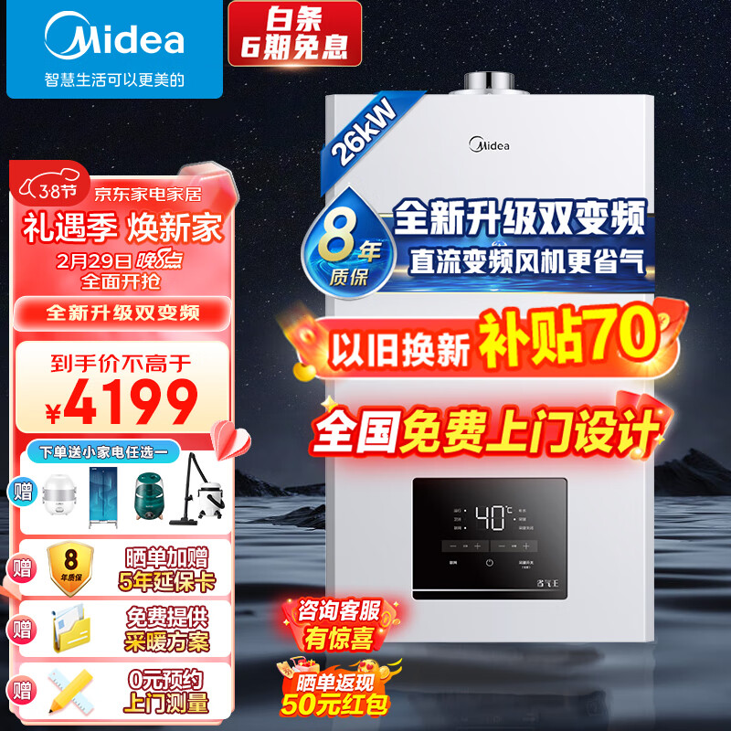 美的(Midea)双变频省气恒温燃气壁挂炉家用地暖暖气片锅炉采暖洗浴两用燃气热水器 分段燃烧L1GB26-R03价格:4199.00元!