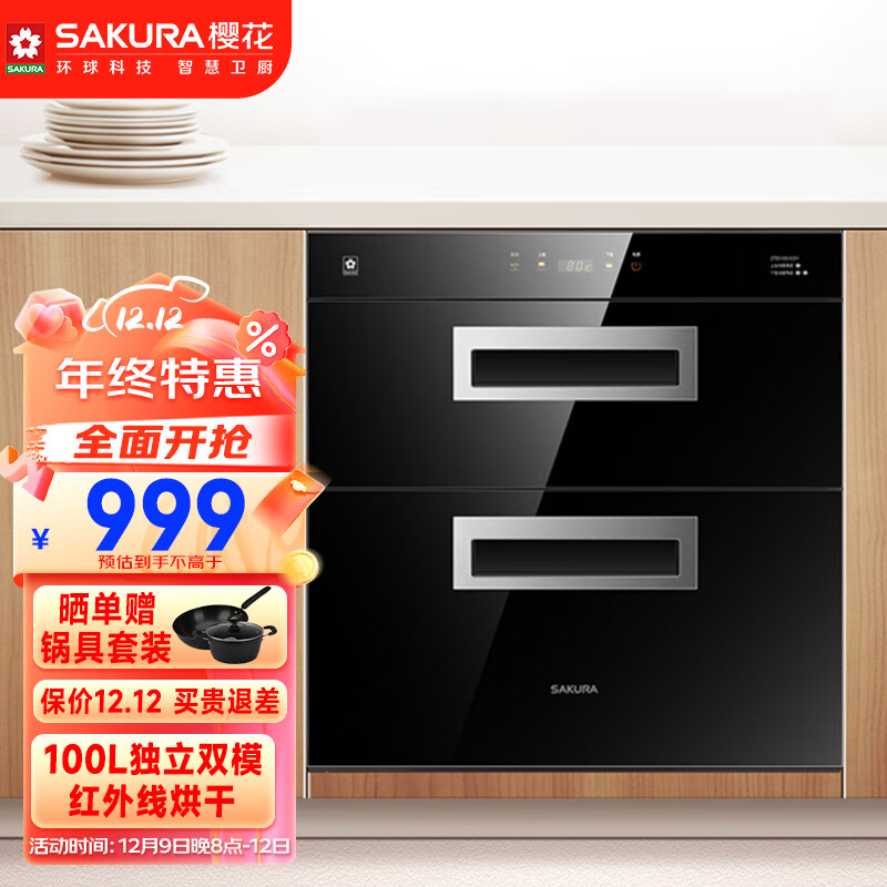 樱花(SAKURA)消毒柜家用嵌入式 臭氧+紫外线+高温 100L独立双模嵌入式碗柜 消毒红外线烘干 ZTD100-C01价格:1199.00元!
