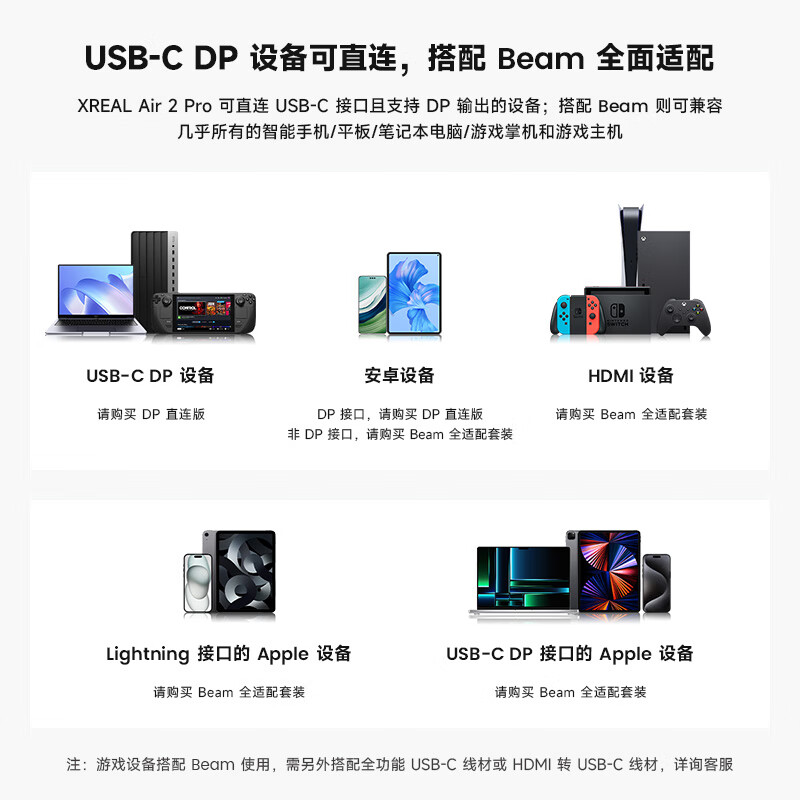 2、买了Air2Pro+Beam,体验了几天才来评价的,感觉还是蛮惊艳的,手机可以直连,眼镜接上beam很方便。重点在可变色功能,有按键调整非常便捷。眼镜采用轻量化材料打造,整体重量轻盈,同时采用可调节的鼻托和耳托设计,能够根据自己的脸型和舒适度进行个性化调整。电致变色试了下3挡还是很黑的,色彩清晰度还是不错的,声音的话感觉音质还行,用它看电影、玩游戏的视觉体验真的非常震撼,实现真正的巨幕式观影!