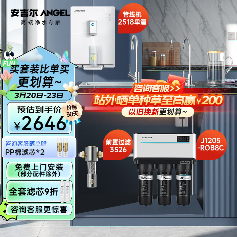 安吉尔J1205-ROB8C净水器家用过滤器套装【1205+前置3526+管线机2518】厨下式反渗透纯水机双出水机价格:2646.00元!
