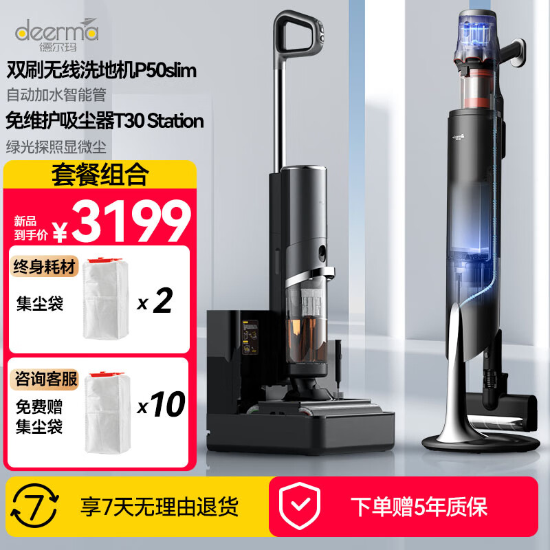 德尔玛(Deerma)【双基站套装】P50-Slim洗地机+T30S自动集尘吸尘器 自动加水双向爆洗自清洁热风烘干洗地价格:3199.00元!
