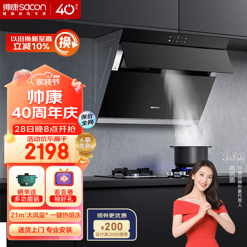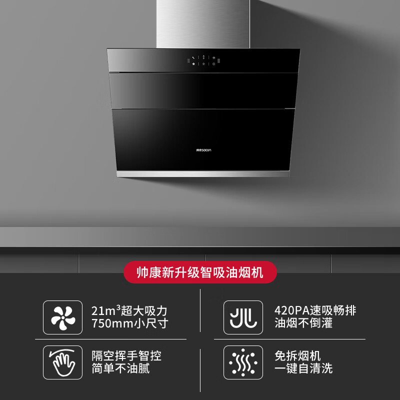 帅康(Sacon)抽油烟机 大吸力侧吸式挥手智控抽油烟机75CM小户型烟机S8905S+61B天然气套装价格:2198.00元!