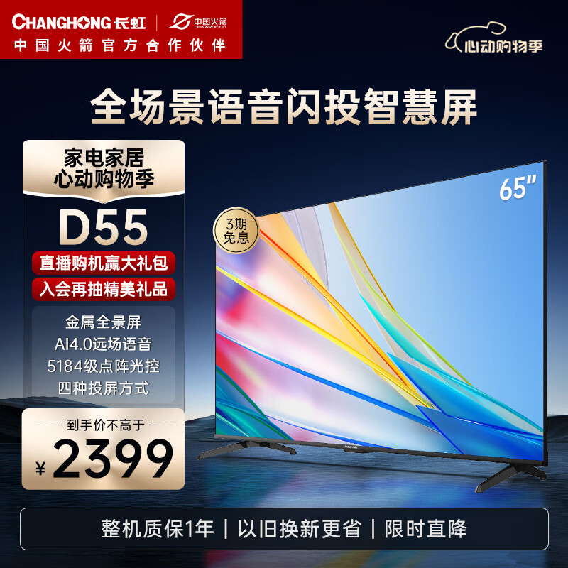 长虹电视65D55 65英寸4K超高清 免遥控语音 全景屏 2+16GB 四大投屏 平板液晶LED电视机 以旧换新价格:2399.00元!
