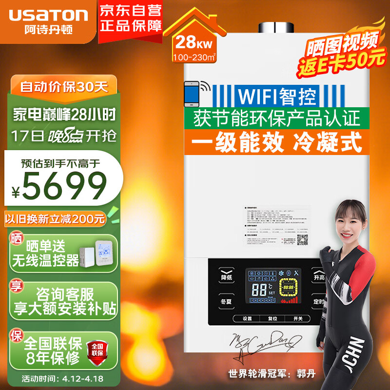 阿诗丹顿(USATON)一级能效冷凝机 燃气壁挂炉天然气地暖锅炉暖气片采暖燃气洗浴恒温热水器LL1PBD28-L2816SWIFI版价格:5699.00元!
