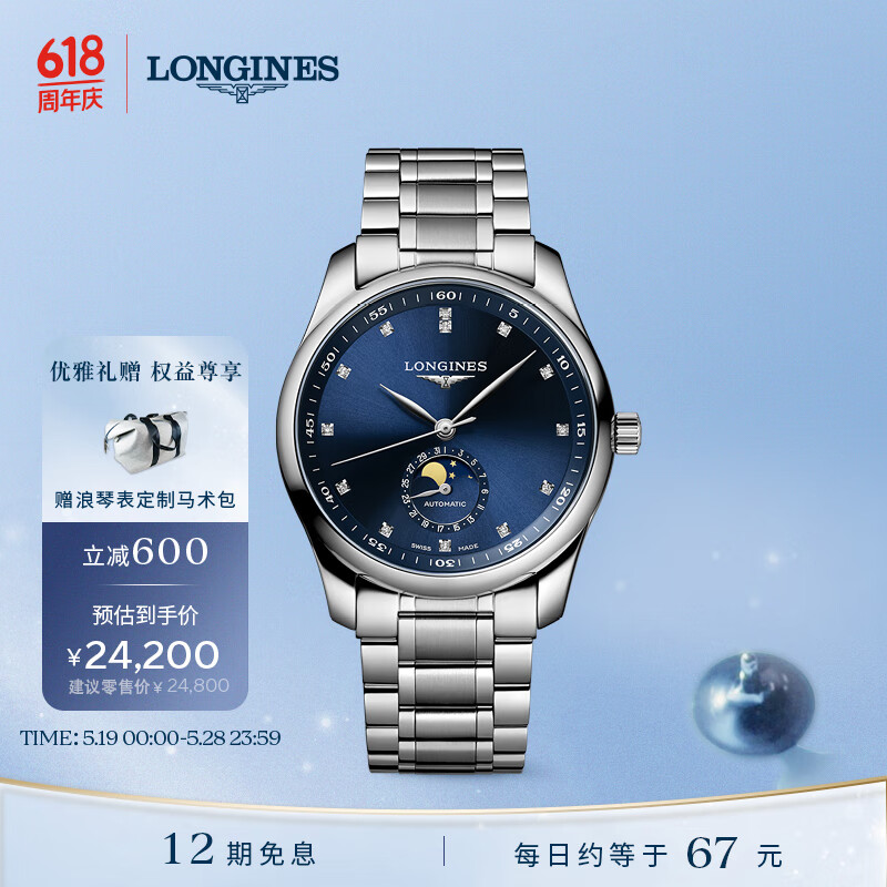浪琴(LONGINES)瑞士手表 名匠系列 月相机械钢带男表 L29094976价格:24200.00元!