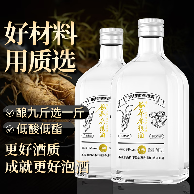 谷养康粮食酒泡酒用酒瓶装清香高粱酒白酒泡果酒泡动植物料酒真粮酒 52度 500mL 2瓶 【质选】适合植物类价格:416.00元!