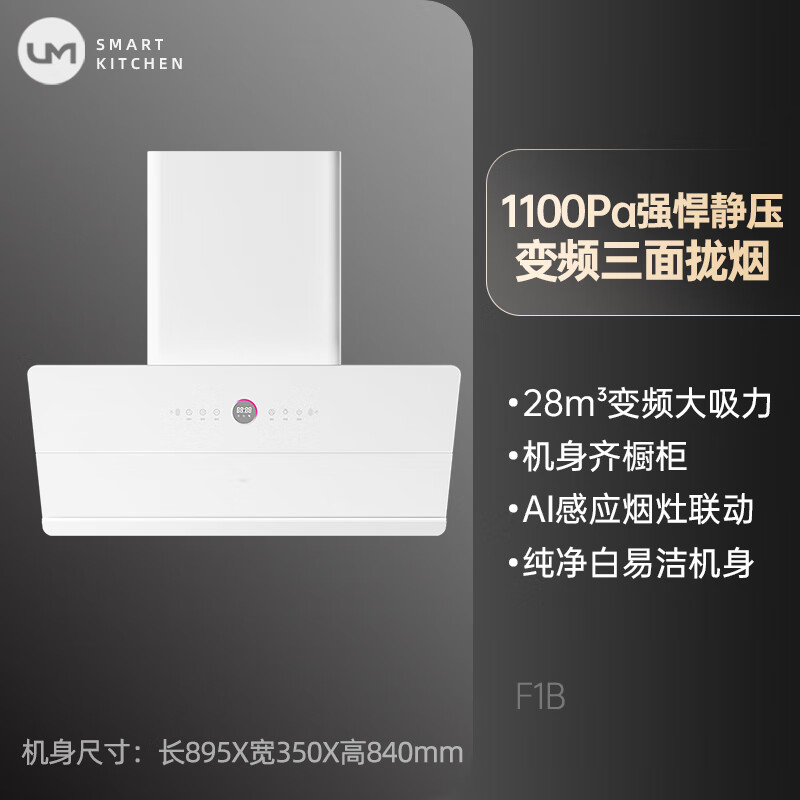 优盟(UM)直流变频抽油烟机白色 家用大吸力侧吸式抽烟机自动清洗 一级能效自动开合28立方脱排免拆洗CP909H价格:1699.00元!