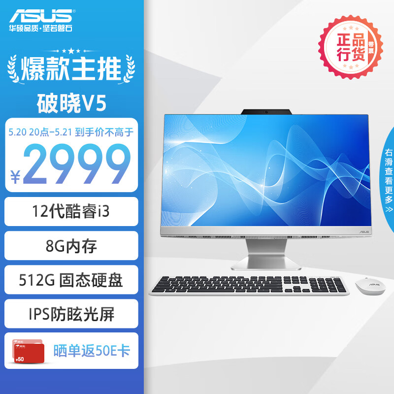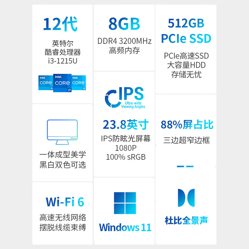 华硕破晓V5 23.8英寸家用商用一体机电脑台式电脑(12代i3-1215U 8G 512G固态 WIFI6蓝牙)白价格:2999.00元!