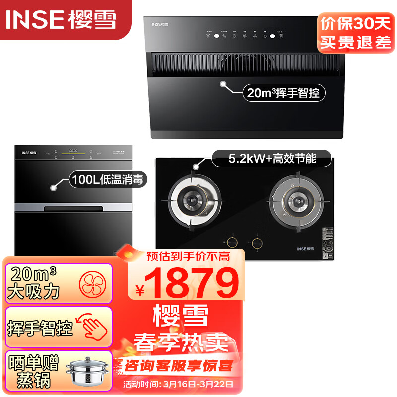 樱雪(INSE)抽油烟机 烟灶消三件套装 20m3/min小尺寸油烟机5.2kW猛火天然气灶具 消毒柜2325+2319天然气+2122价格:2079.00元!