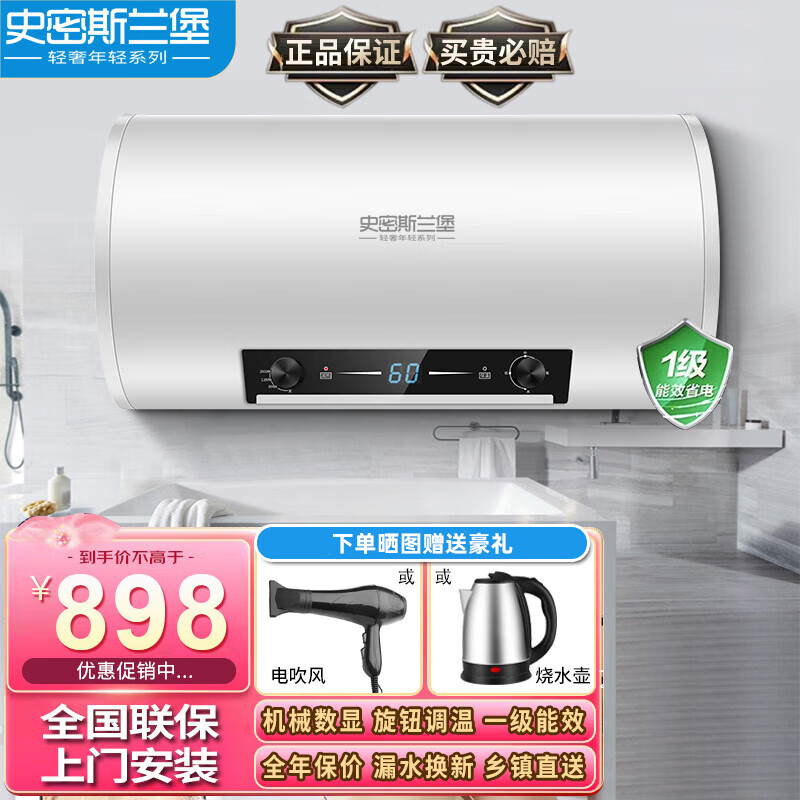 史密斯兰堡电热水器储水式 家用100升L家用恒温2200W双重防护卫生间出租房速热洗澡淋浴一级能效DSZF-T02Y100价格:858.00元!