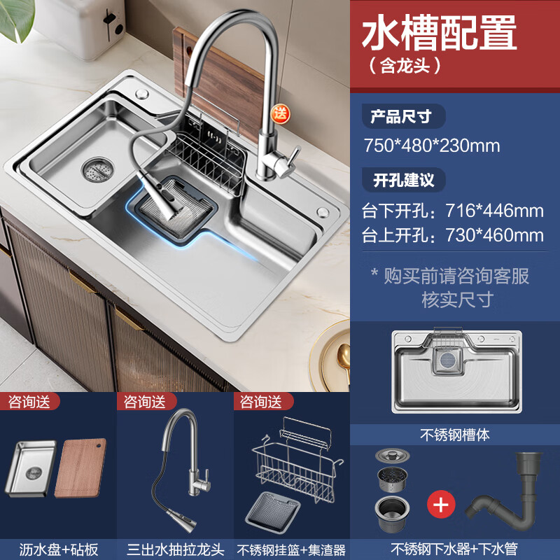箭牌(ARROW)304不锈钢水槽 日式大口径单槽厨房洗菜盆台上盆大单槽 75*48聚宝盆单槽+冷热抽拉龙头价格:1429.00元!