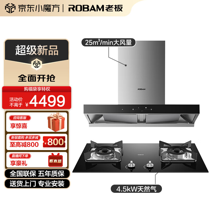 老板(Robam)抽油烟机D3S欧式顶吸双腔变频25大风量家用燃气灶吸油烟机灶具套装65D3S+30B6D套装(天然气)价格:4498.00元!