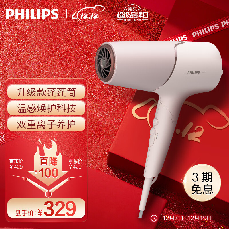 飞利浦(PHILIPS)电吹风机 温感焕护4千万负离子 矿物质锌离子 大功率速干 BHD538/05 柔漾粉价格:329.00元!
