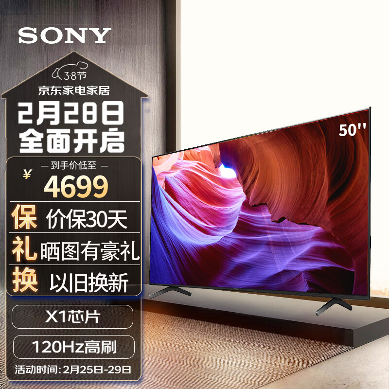 索尼(SONY)KD-50x85K 50英寸 4K HDR超高清屏 120Hz高刷 X1芯片 安卓智能液晶平板电视 黑色价格:4699.00元!
