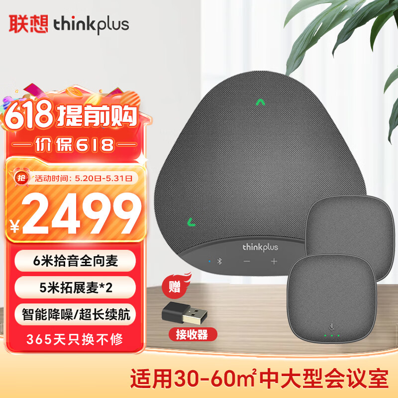 联想thinkplus视频会议办公设备蓝牙会议全向麦克风音响拾音会议扬声器适用40-70平米(全向麦+收音*2)价格:2499.00元!