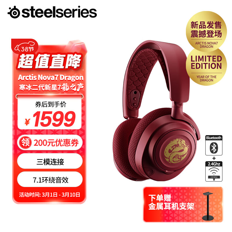 赛睿(SteelSeries)Arctis 寒冰Nova7 龙之声龙年定制电竞游戏耳机 头戴式 2.4G蓝牙有线三模连接听声辨位降噪麦克风价格:1799.00元!