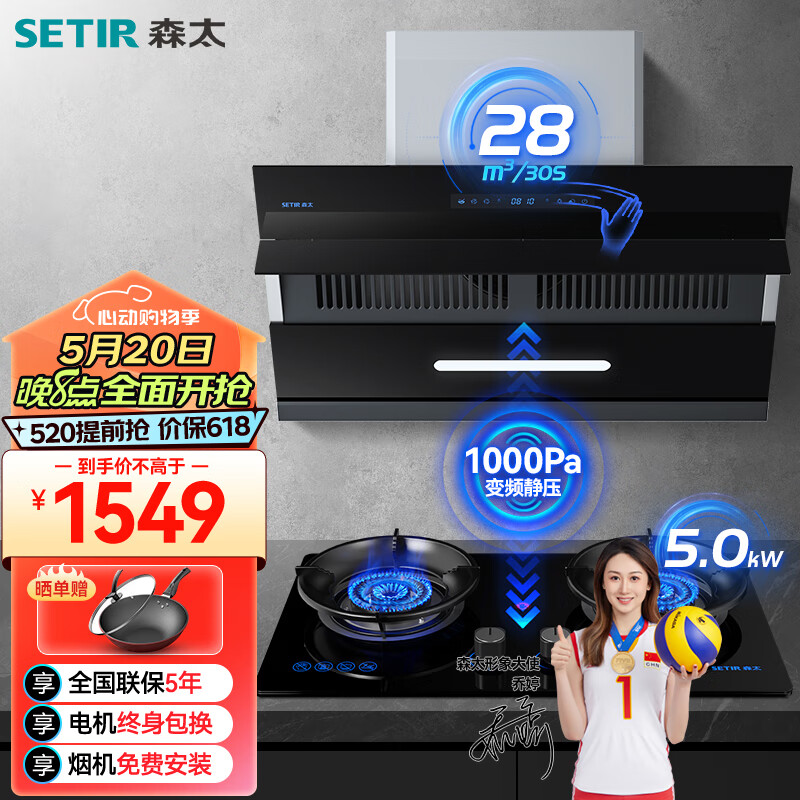 森太(SETIR)侧吸式抽油烟机烟灶套装 变频巡航大吸力家用吸油烟机 5.0kW聚能猛火灶具 B690BQ+TA19液化气价格:1749.00元!